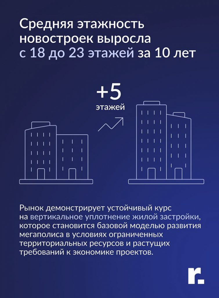 Москва за последние 10 лет стала заметно выше — в прямом смысле слова. По данным наших аналитиков, средняя этажность новостроек внутри МКАД увеличилась на пять этажей.