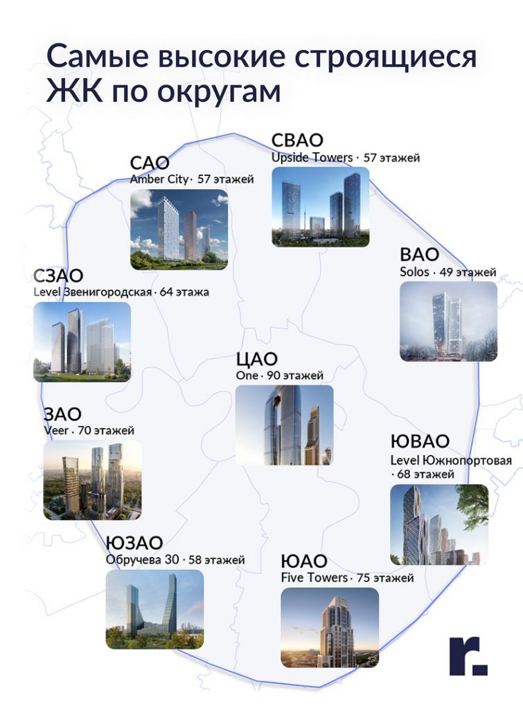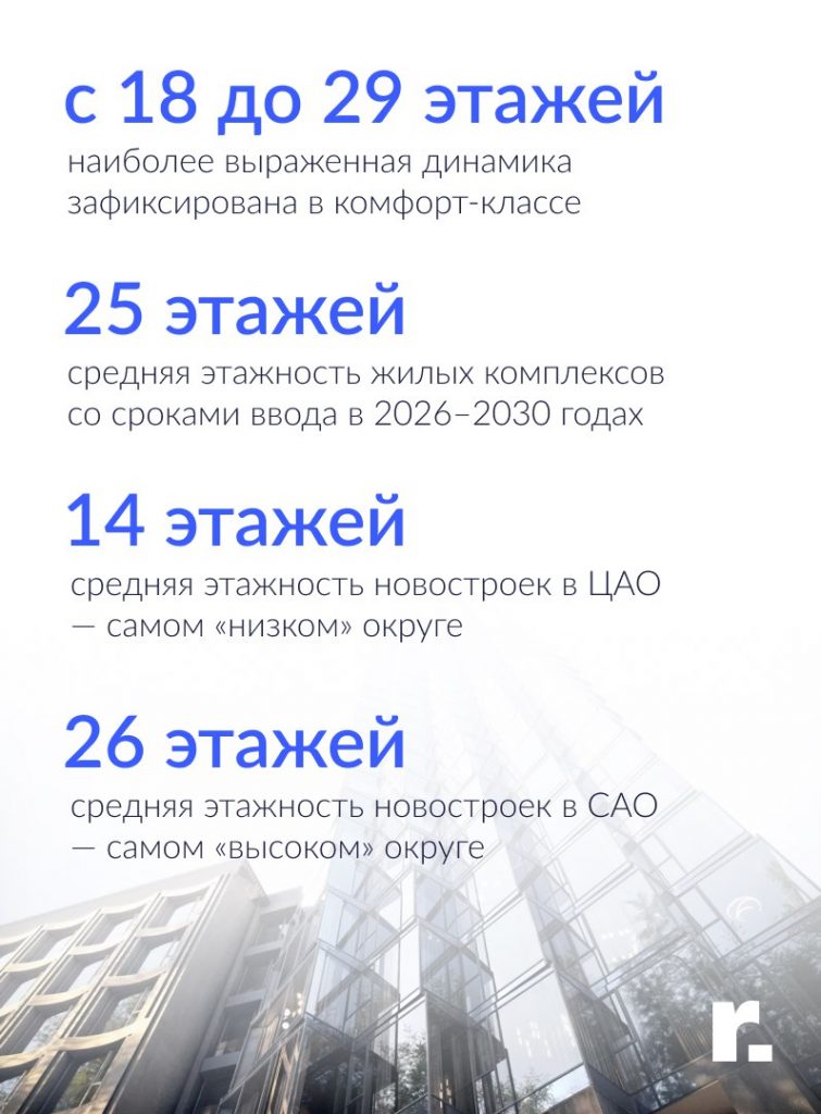 - Самый «низкий» округ — ЦАО, где историческая застройка накладывает ограничения. А в САО средняя высота новостроек уже достигает 26 этажей.