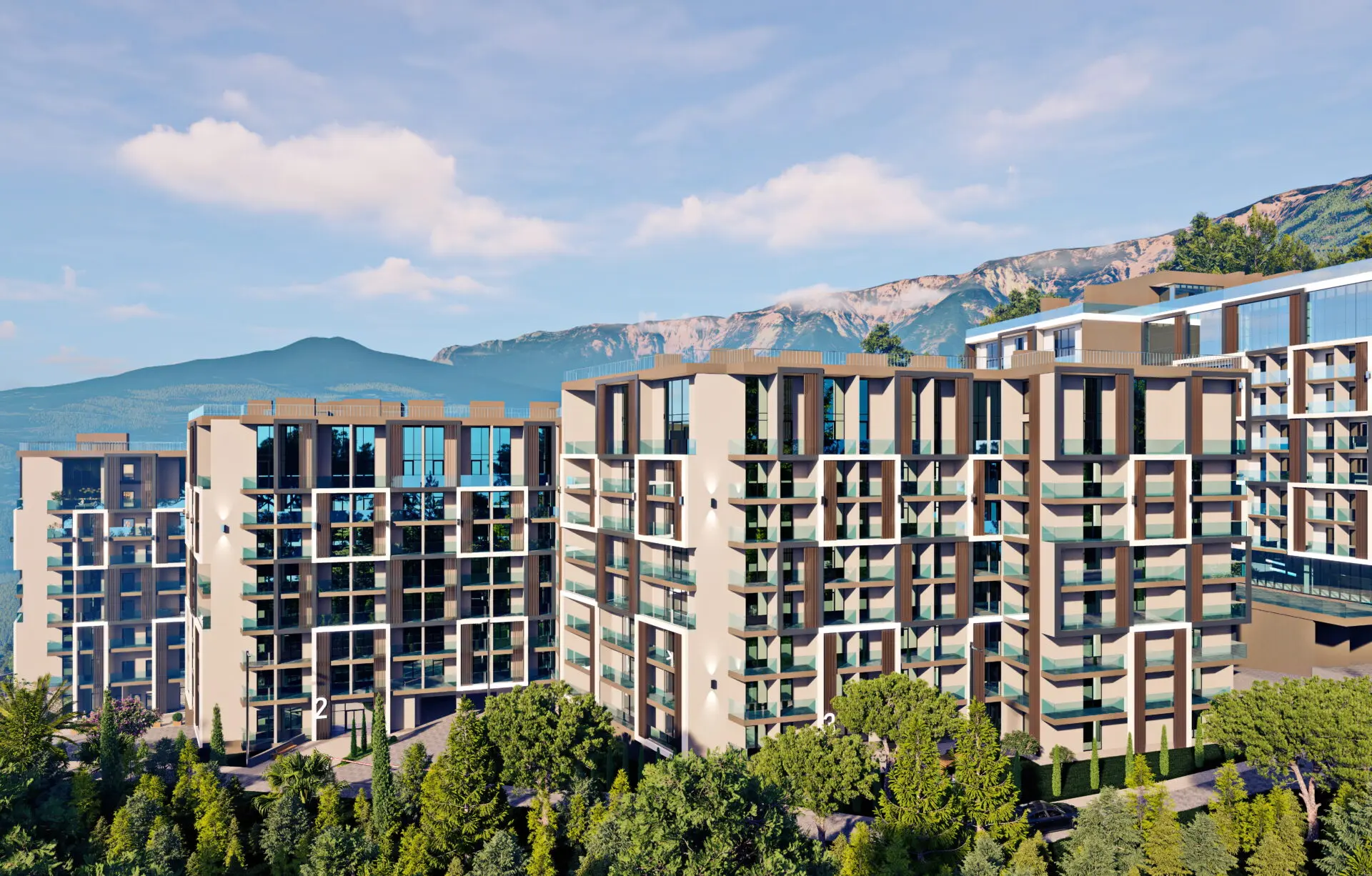 Территория комплекса продумана для комфортной жизни: открытый подогреваемый бассейн с зонами для загара, уютные лаунж-пространства, прогулочные аллеи, детские и спортивные площадки. Благоустройство с озеленением и декоративной подсветкой создаёт атмосферу круглогодичного курорта.