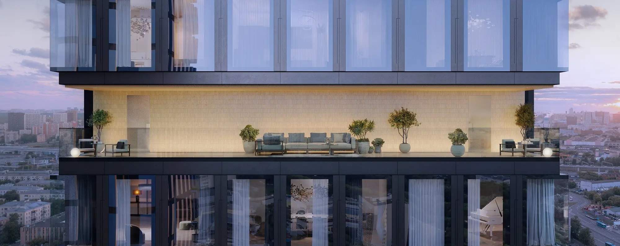 Планировки — настоящая редкость на рынке: двухуровневые лоты с высотой потолков 6,86 м, пентхаусы с террасами и каминами, а также скай-виллы с выходом на открытую террасу.