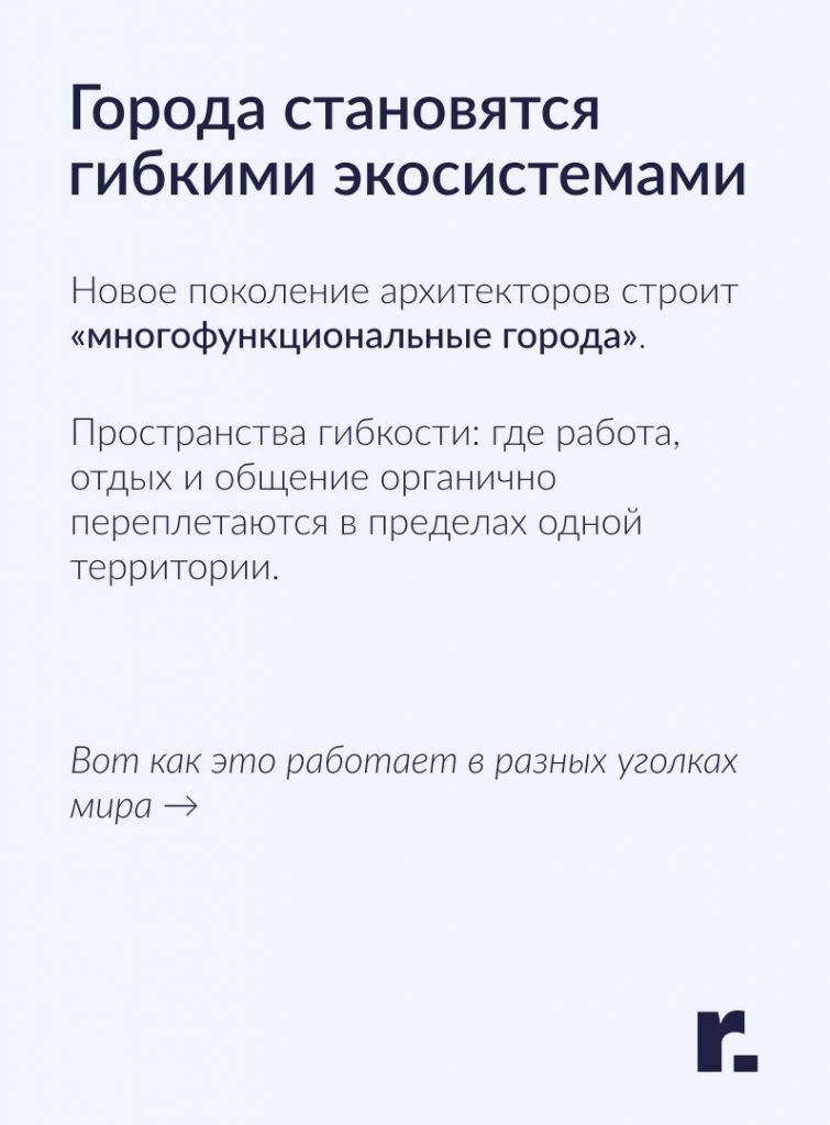 Города будущего — это не просто набор отдельных зон для работы, жизни и отдыха. Это гибкие экосистемы, где всё смешивается, создавая новые возможности для бизнеса и сообществ.