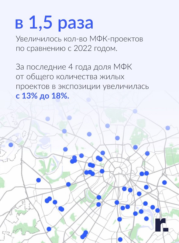 По данным нашего исследования, с 2022 года количество многофункциональных комплексов на рынке жилья Москвы выросло в 1,5 раза: их доля в экспозиции увеличилась с 13% до 18%.