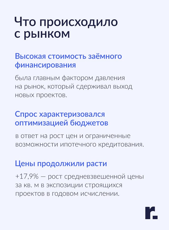 - Стройка замедлилась. Девелоперы снизили активность — новых проектов выходило значительно меньше, чем годом ранее.